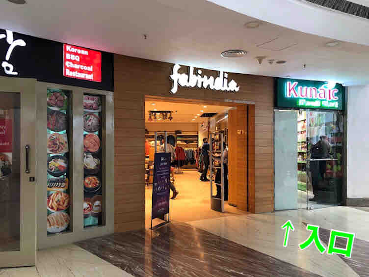 上の画像の矢印の入口のほかに、サウスポイントモールの中からはファブインディアの横に入口があります