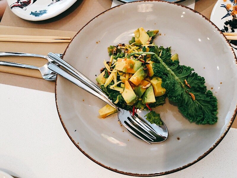 サラダは、アボカド、ローマンゴー、ケールのシラチャードレッシングをチョイス